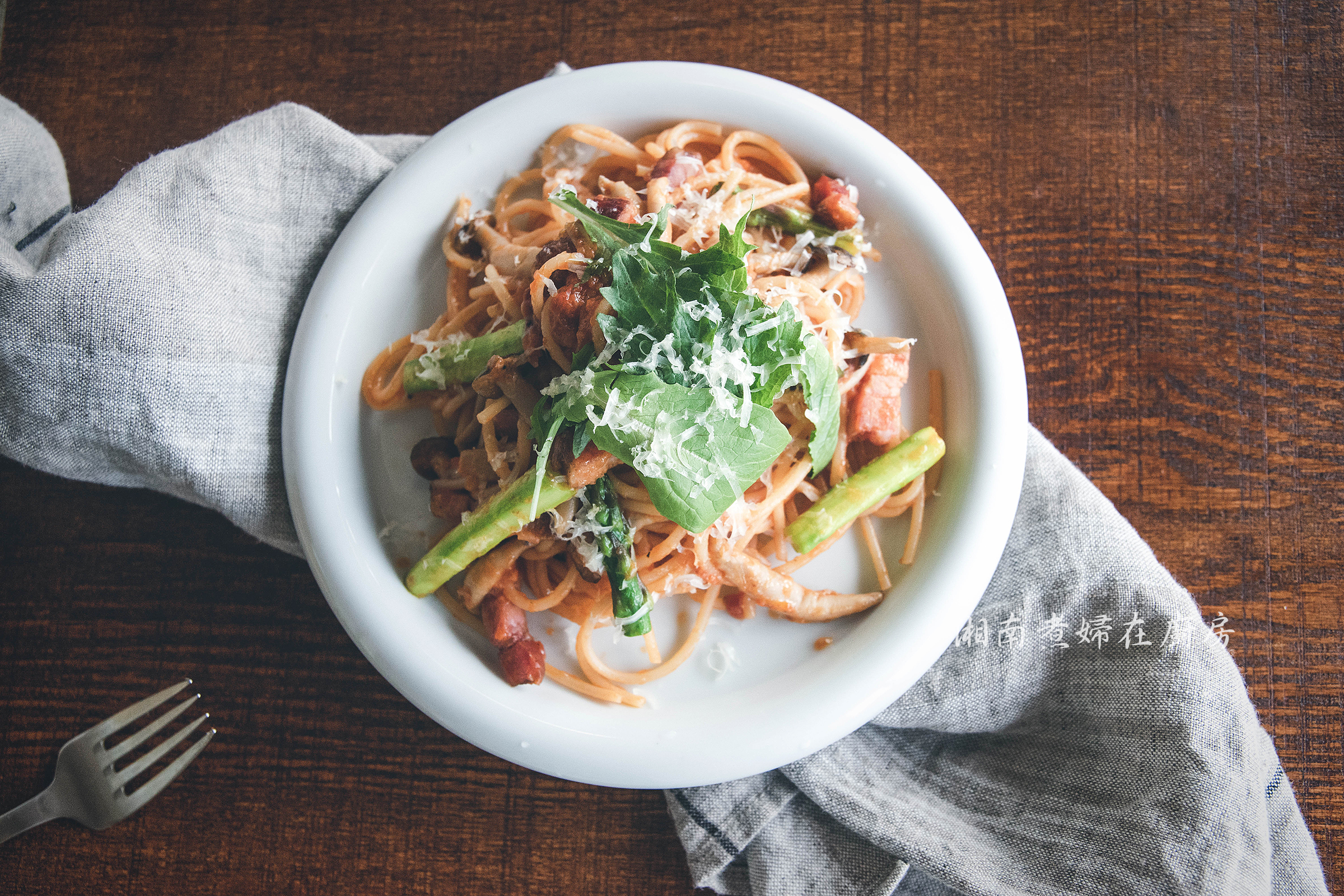 ❻ 麵條倒入平底鍋,倒入事先調理好的培根、蘆筍和菇,全部拌勻,讓麵條吸取醬汁後,可以再加點冷壓橄欖油添香後盛盤。
