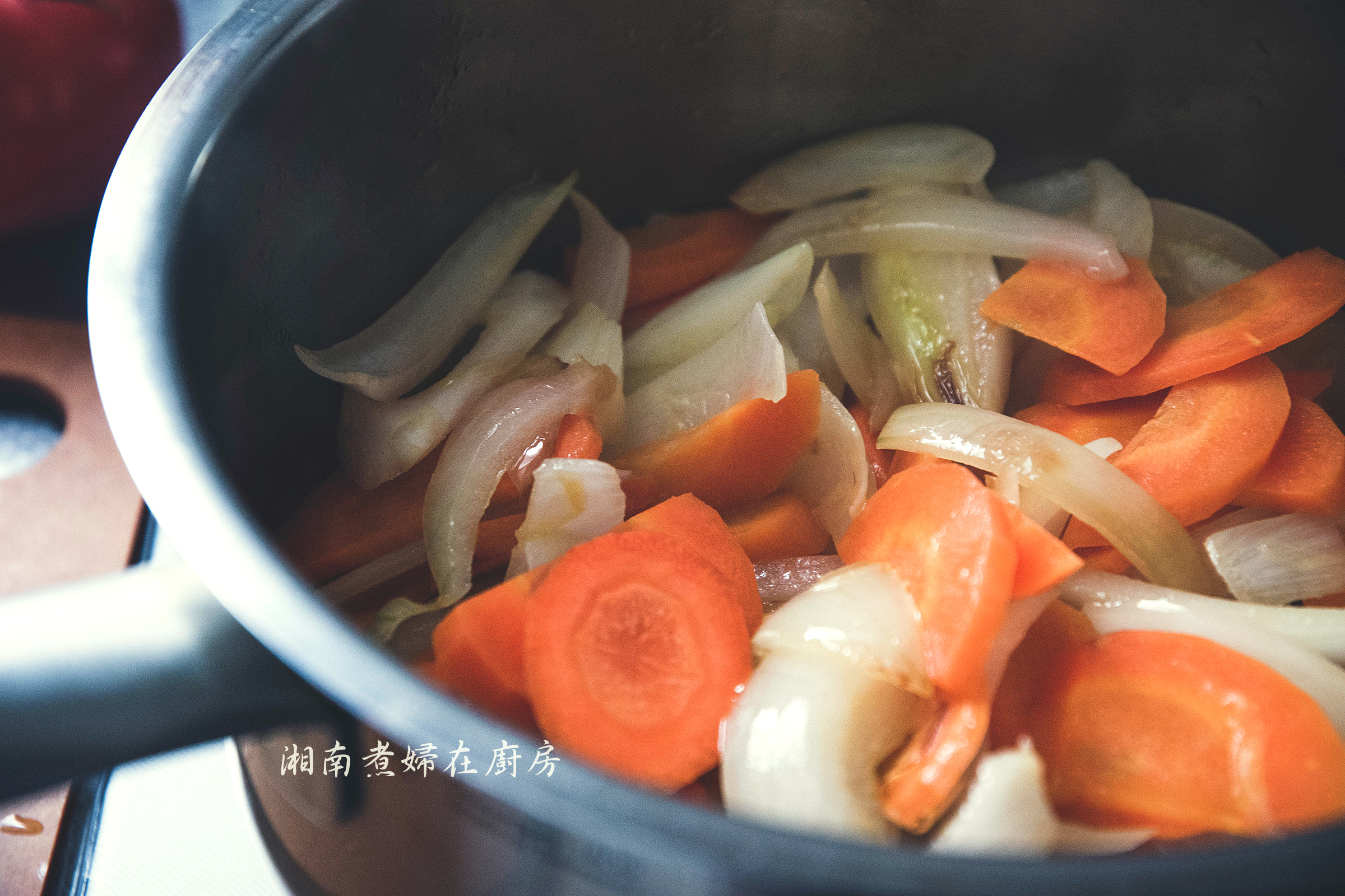 ❶ 鍋內放入料理油,先加入洋蔥、紅蘿蔔,翻炒至邊緣變透明。(第一階段食材)