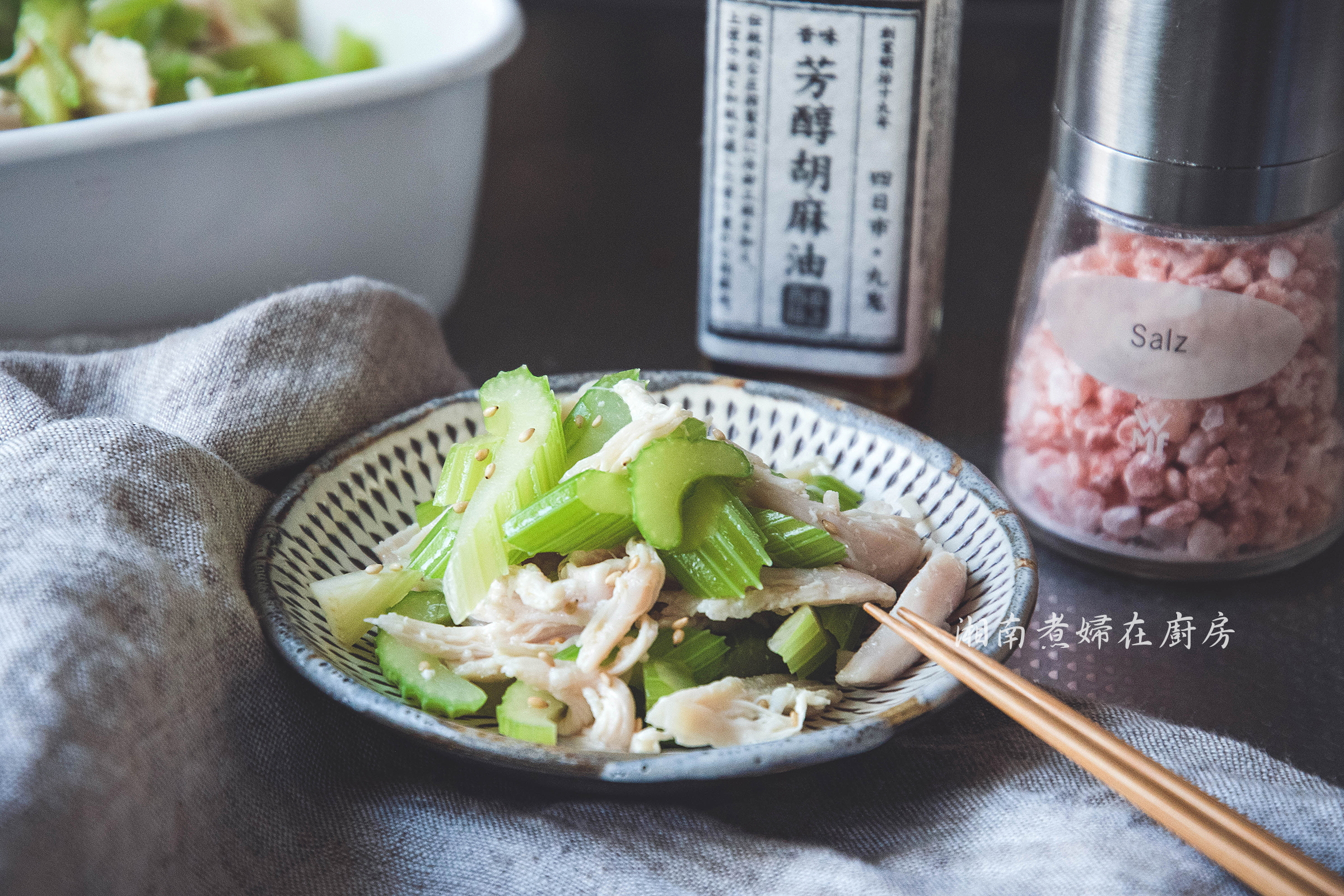 - 西洋芹拌入雞絲,倒入日式芥末油醋醬拌勻後,若有需要,再度灑鹽,最後調味。因為冷得吃,鹽分不夠,冷了味道會較淡,鹽要比平常熱食再多一些的份量。