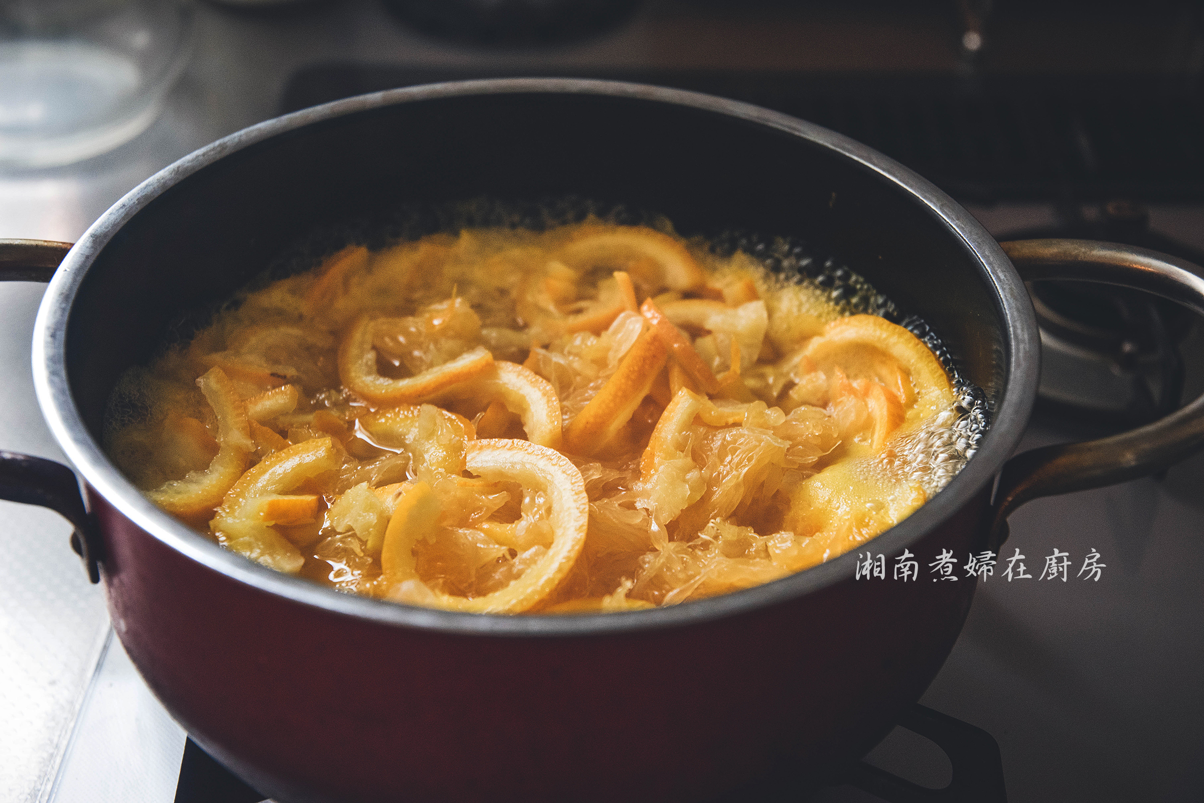 橘子皮內側白色部分,帶苦味,通常需要剝除,才會好吃。婆婆教的這份食譜,不需要剝除皮內側的白色部分,分段浸泡燉煮,成果留著柑橘的香氣,帶著一咪咪苦味,是屬於大人的果醬。