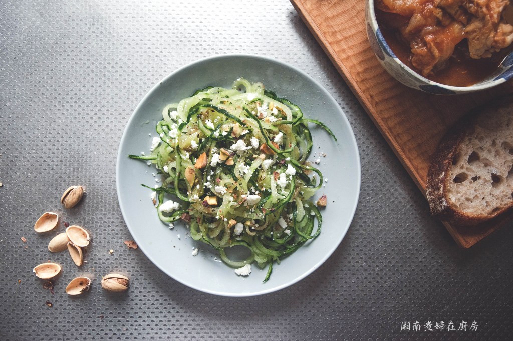 先用半條小黃瓜,就刨出這一小盤,分散後,感覺份量好多,淋上早餐常備的黑胡椒巴薩米克油醋醬,菲達起司,再稍微多點鹽和黑椒調味,最後一點碎開心果,就這樣。