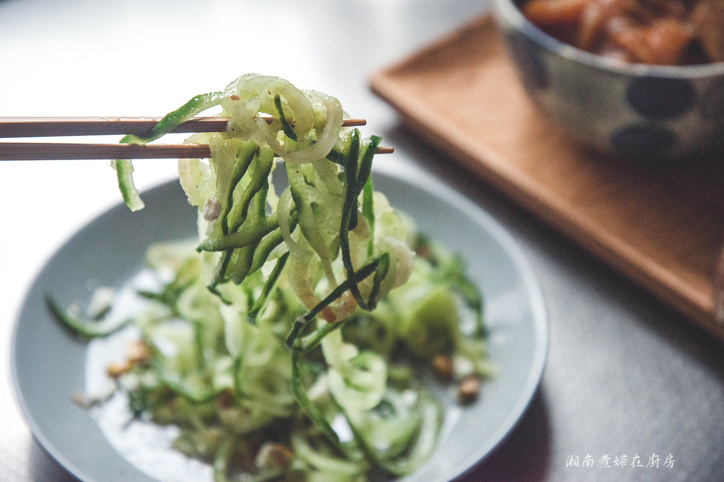 一般單吃黃瓜,會有點無味,需要一些醬汁才會好吃。原先也有點擔心今天的偽麵條,會無味的讓我想放棄,結果被切捲的小黃瓜蔬菜麵,比一般常吃的小黃瓜絲或是小黃瓜片,更容易吸收調味,調味很輕易就被捲進麵條裡,不怕沒滋味。