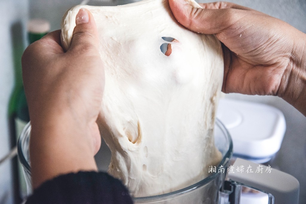 麵團算是已經進入中期的擴展階段,後來又用Bosch補攪打完剩下(約1/3)的流程。Magimix揉麵團確實可行,做甜麵包,擴展階段就蠻足夠了,但是跟麵包機ㄧ樣,若想要做好吃的吐司,就需要好好控制溫度,也許是打一分鐘後,先檢查溫度,視狀況添加冰水,並且調整麵團位置,免得卡刀,再進行下一分鐘的攪打,直到麵團符合要求。
