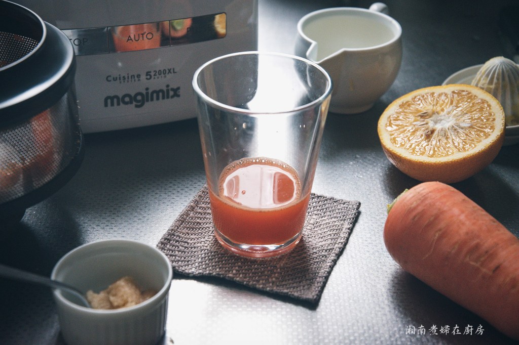 這天試了榨了根紅蘿蔔,不太大的紅蘿蔔,就榨出這一杯,另外再擠一顆柑橘汁,和蜂蜜一起,全部攪拌一下,沒有加水的「蜂蜜紅蘿蔔橘子汁」,跟爸爸兩人分完,只能竪拇指,超好喝的!!