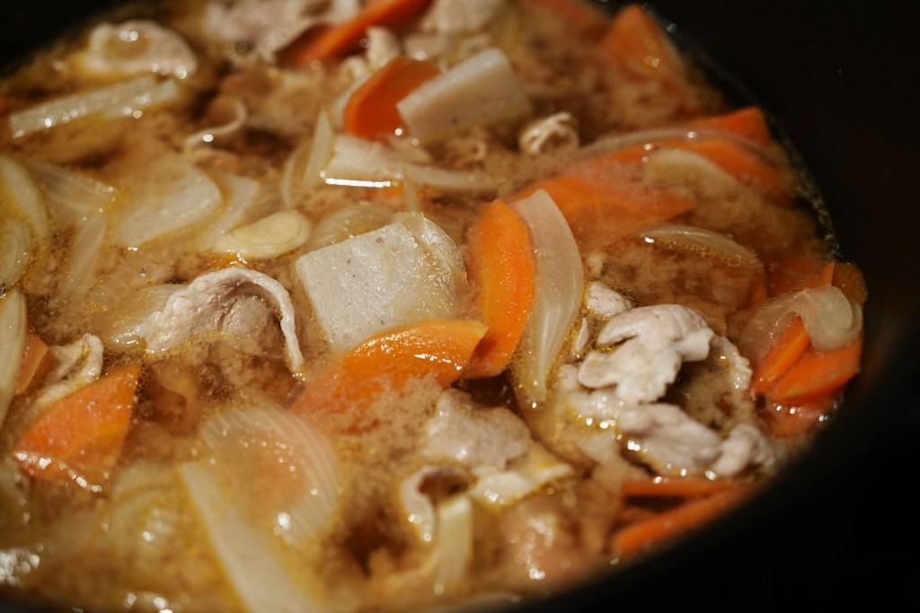 而且,洋蔥、牛蒡、紅蘿蔔只要過油炒過就會變得很甜,也不會有討厭的腥味,煮湯之後加味增,只有甜味,不挑食的孩子也可以吃喔。