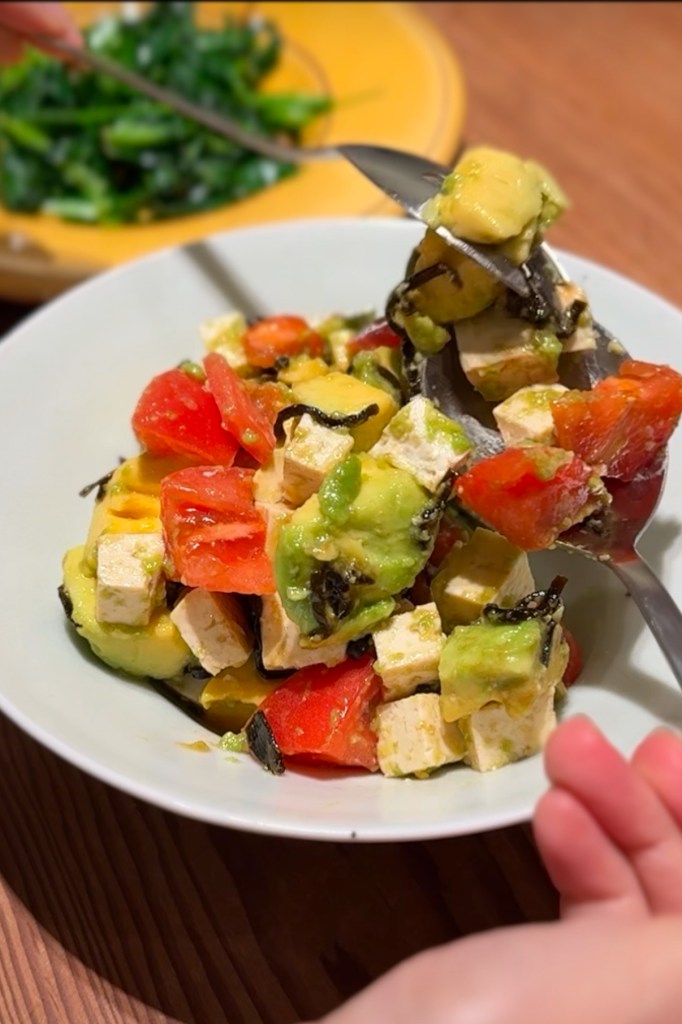 - 將酪梨、蕃茄、豆腐、鹽昆布,鹽和橄欖油一起放入調理碗中攪拌,就完成囉。